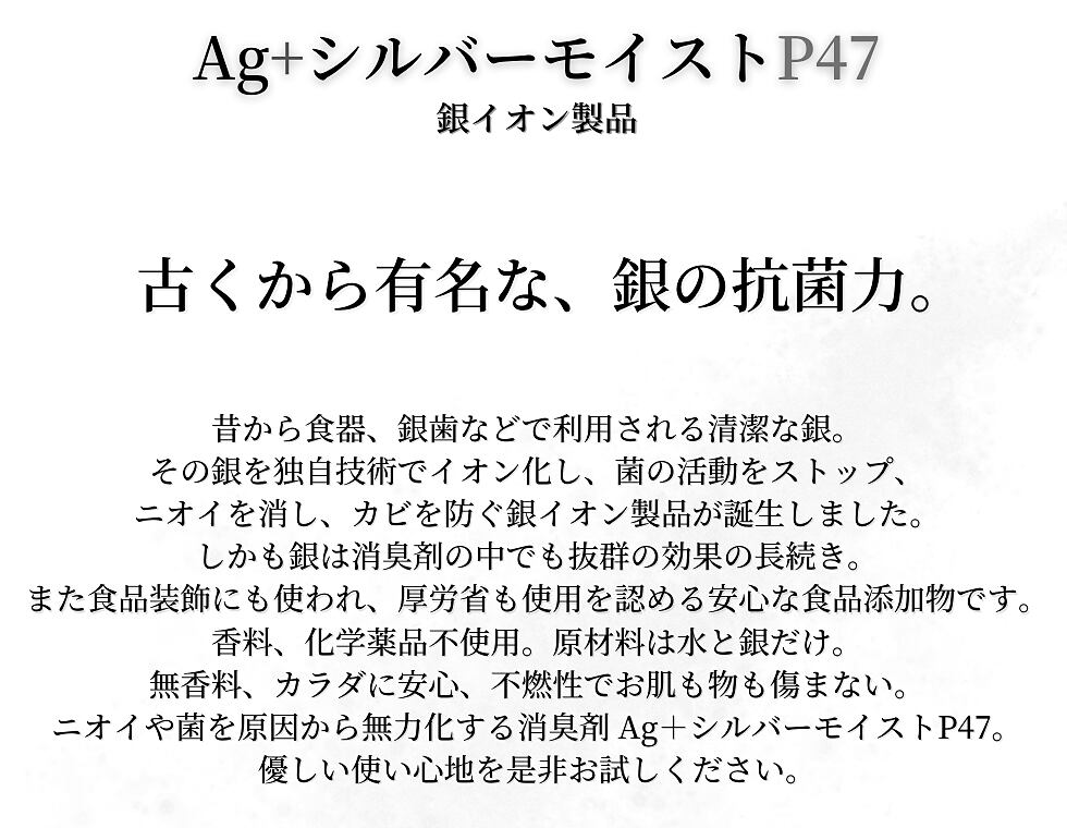 無香料でカラダに安心、優しい抗菌Ag+シルバーモイストP47除菌消臭剤。