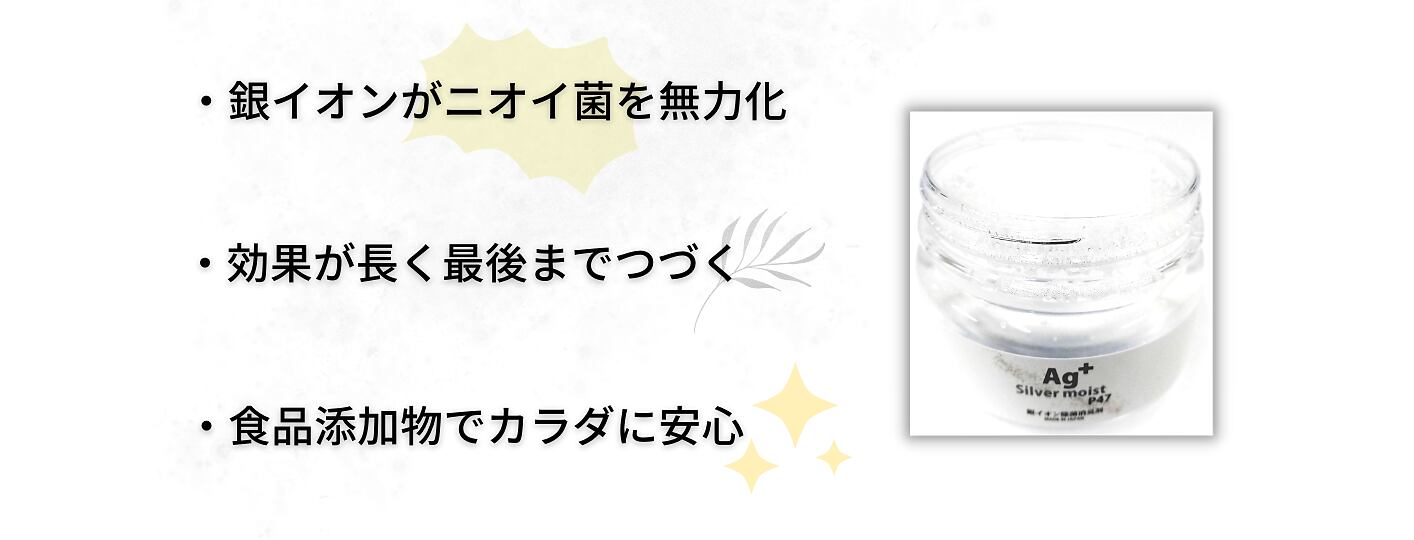銀という貴金属の抗菌力が、置いておくだけでカビやニオイ、生活臭に対して常に効果を発揮、消臭します。