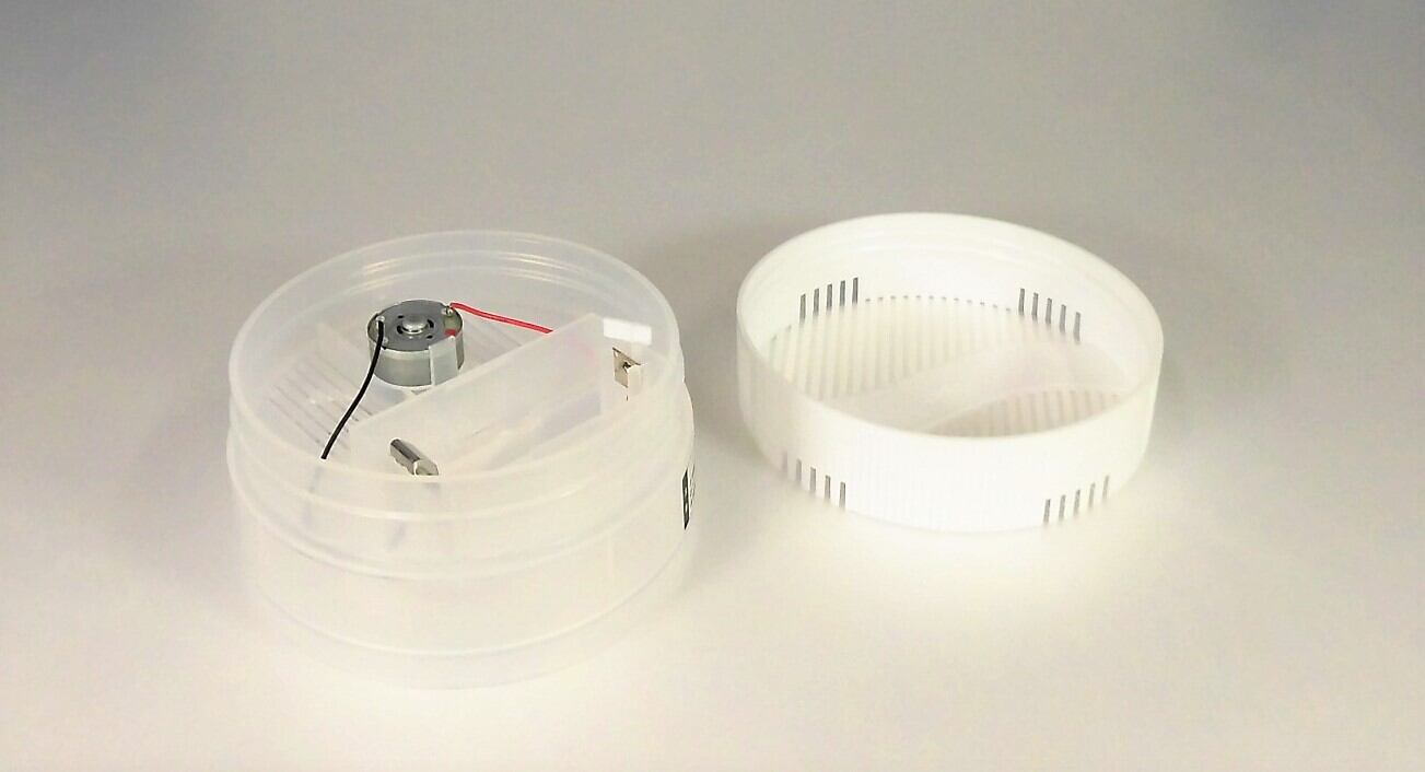 送風機の中に中フタを外した消臭剤を設置します。送風機上部に電池を入れスイッチを入れるとファンが回り成分を拡散させます。使わない時は電池を外してください。